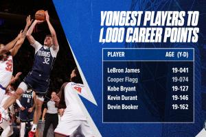 据统计,弗拉格(19岁74天)是历史第二年轻拿到1000分的球员,仅次于詹姆斯(19岁41天)。